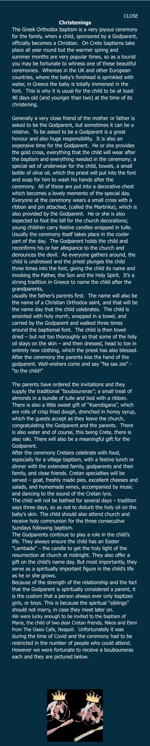 The Greek Orthodox baptism is a very joyous ceremony for the family, when a child, sponsored by a Godparent, officially becomes a Christian. On Crete baptisms take place all